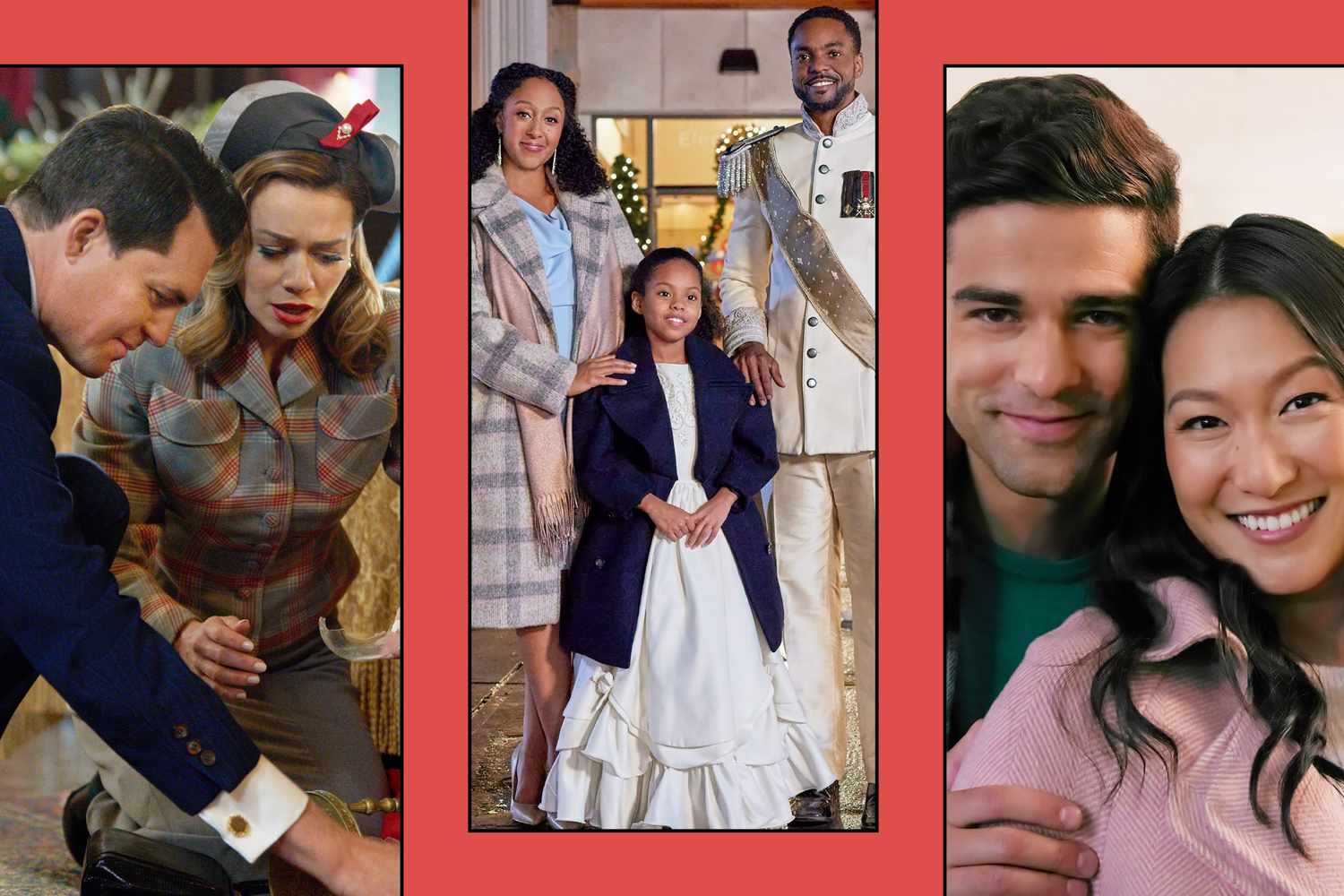 Kristoffer Polaha as Jack Huston and Bethany Pleasure Lenz as Lucy Collins in 'A Biltmore Christmas'; Tamera Mowry-Housley as Shelby, Isabel Birch as Grace, and Ronnie Rowe Jr. as Evan in 'Inventing the Christmas Prince'; Markian Tarasiuk as Blake and Kara Wang as Romy in 'Christmas on the Golden Dragon'. Credit score: