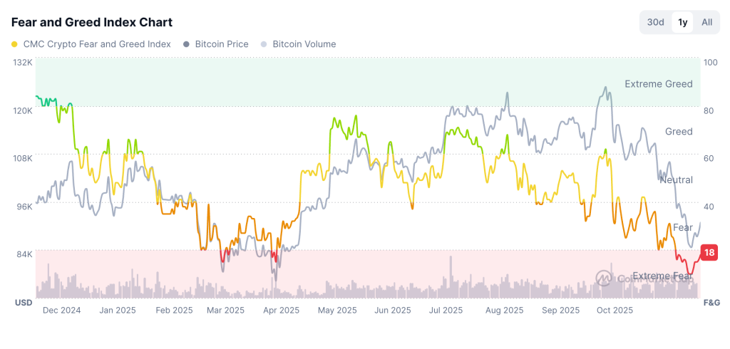 Excessive worry nonetheless dominates crypto buying and selling; the Crypto Concern and Greed gauge rose to 18 immediately, solely barely above final week’s low readings round 10, which marked the deepest stress for the reason that index appeared.